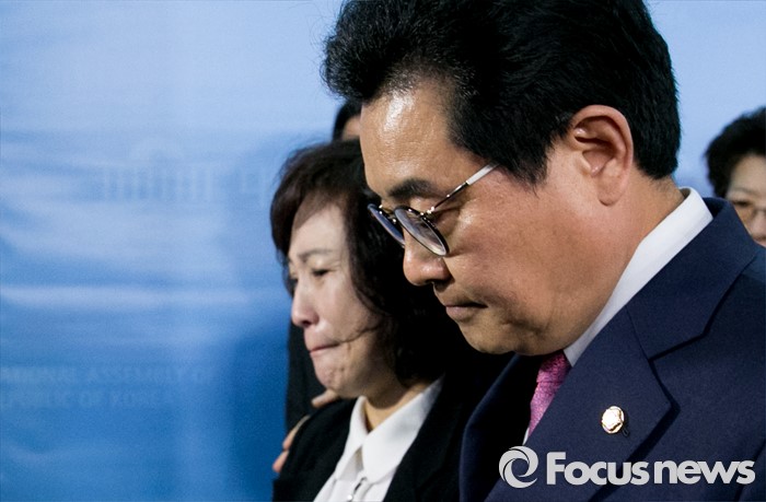 (서울=포커스뉴스) 20대 총선을 앞두고 공천 배제(컷오프)된 전병헌(오른쪽) 더불어민주당 의원이 22일 오전 서울 여의도 국회 정론관에서 대선승리를 위한 백의종군 선언 기자회견을 마친 뒤 아내 조영아 씨와 함께 나서고 있다.