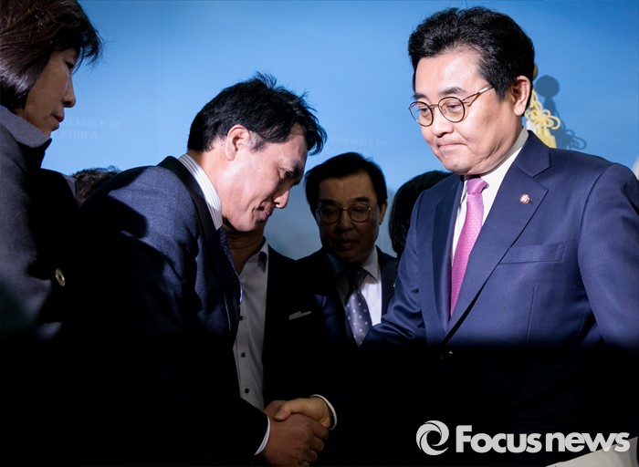 (서울=포커스뉴스) 20대 총선을 앞두고 공천 배제(컷오프)된 전병헌(오른쪽) 더불어민주당 의원이 22일 오전 서울 여의도 국회 정론관에서 대선승리를 위한 백의종군 선언 기자회견을 마친 뒤 지지자들과 악수하고 있다.