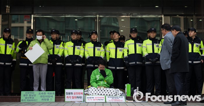 (서울=포커스뉴스) 국민의당에서 공천 탈락한 정용화 전 광주유니버시아드 조직위원회 부위원장이 22일 오전 서울 마포구 국민의당 당사 앞에서 경선 결과에 부당함을 호소하는 시위를 하고 있다.