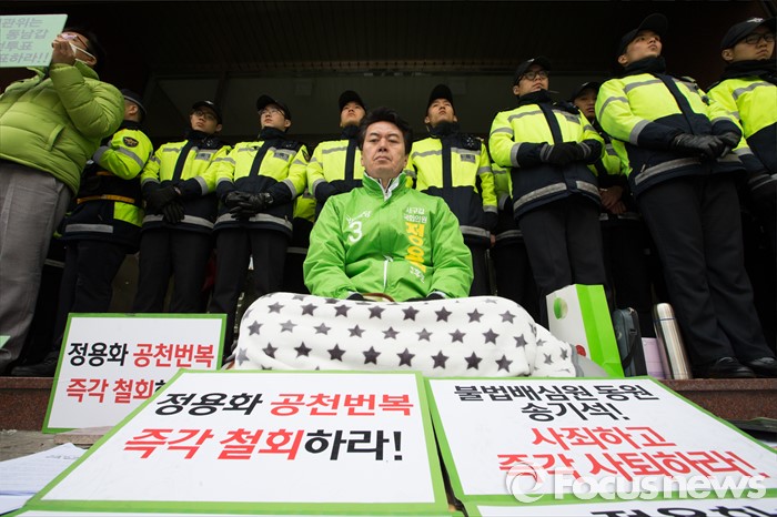 (서울=포커스뉴스) 국민의당에서 공천 탈락한 정용화 전 광주유니버시아드 조직위원회 부위원장이 22일 오전 서울 마포구 국민의당 당사 앞에서 경선 결과에 부당함을 호소하는 시위를 하고 있다.