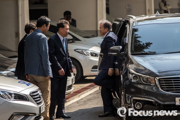 (서울=포커스뉴스) 문재인 전 더불어민주당 대표가 김종인 비상대책위 대표와 면담하기 위해 22일 오후 서울 종로구 김 대표 자택으로 이동하기 위해 하차 하고 있다.