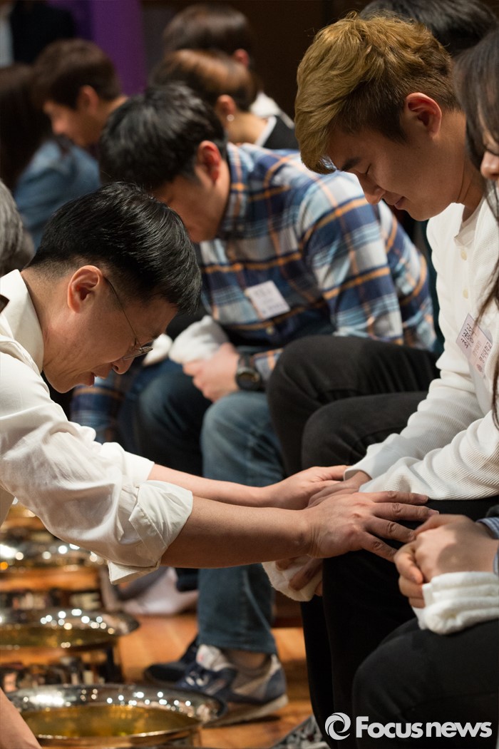 (서울=포커스뉴스) 22일 오후 서울 서대문구 명지대학교 세족식 행사에서 한 교직원이 학생의 발을 씻긴 후 기도를 하고 있다.