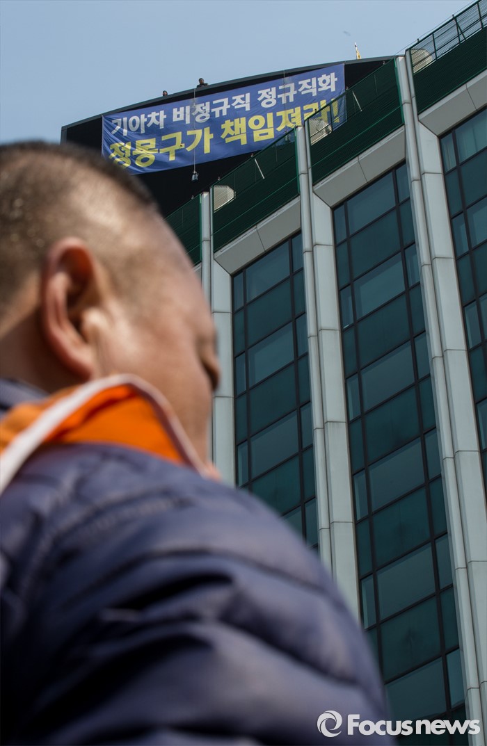 (서울=포커스뉴스) 22일 오전 서울광장 인근에서 열린 2016 비정규직 총선연대 발족식 참석자 위로 기아차 사내하청 비정규직 노동자 한규협 최정명씨가 고공농성을 284일째 이어가고 있다.