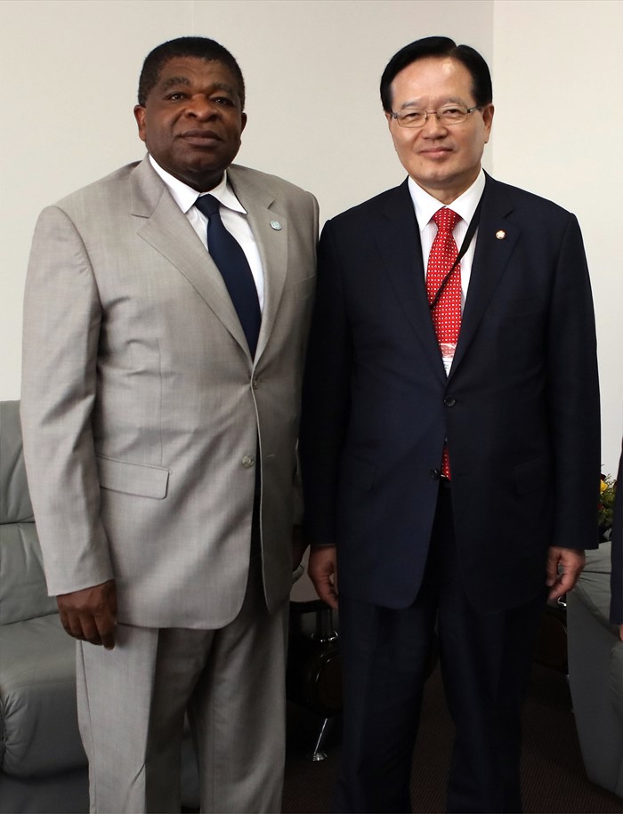(서울=포커스뉴스) 정의화(오른쪽) 국회의장이 21일 오후(현지시각) 잠비아에서 열린 IPU(Inter-Parliamentary Union, 국제의회연맹) 총회에 참석해 마틴춘공(Martin CHUNGONG) 사무총장과 면담에 앞서 기념촬영을 하고 있다. <사진제공=국회>