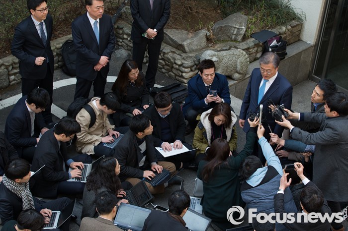 (서울=포커스뉴스) 문재인 더불어민주당 전 대표가 22일 오후 서울 종로구 구기동의 김종인 비상대책위원회 대표와 면담 후 김 대표 자택을 나서며 취재진 질문에 답하고 있다.