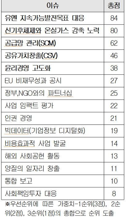 전체 16개 항목 중 우선순위에 따라 3개 이슈를 고르는 설문 결과 ‘유엔 지속가능발전목표 대응’이 총 84점으로 가장 높은 점수를 받았다. △신기후체제와 온실가스 감축노력(80점) △공급망 관리(62점) △공유가치창출(46점) △윤리경영 고도화(38점)이 그 뒤를 따랐다.