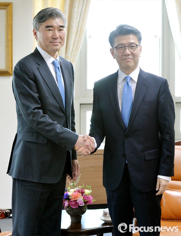 (서울=포커스뉴스) 성김(왼쪽) 국무부 대북정책특별대표와 김홍균 한반도평화교섭본부장이 22일 서울 종로구 외교부에서 열린 '한·미 북핵 6자회담'에 참석해 인사를 나누고 있다.