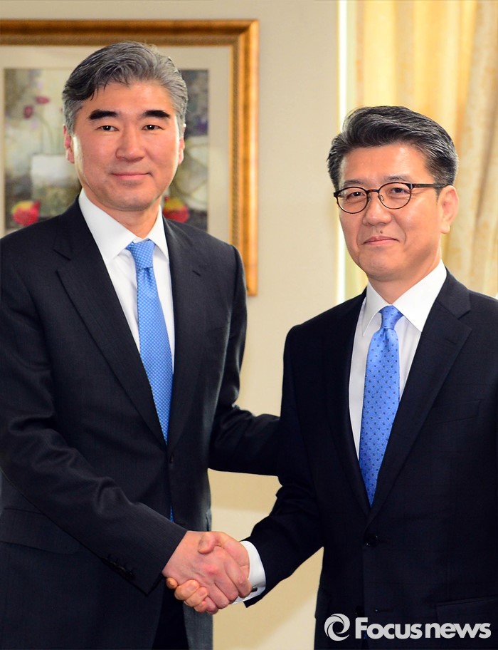 (서울=포커스뉴스) 성김(왼쪽) 국무부 대북정책특별대표와 김홍균 한반도평화교섭본부장이 22일 서울 종로구 외교부에서 열린 '한·미 북핵 6자회담'에 참석해 인사를 나누고 있다.
