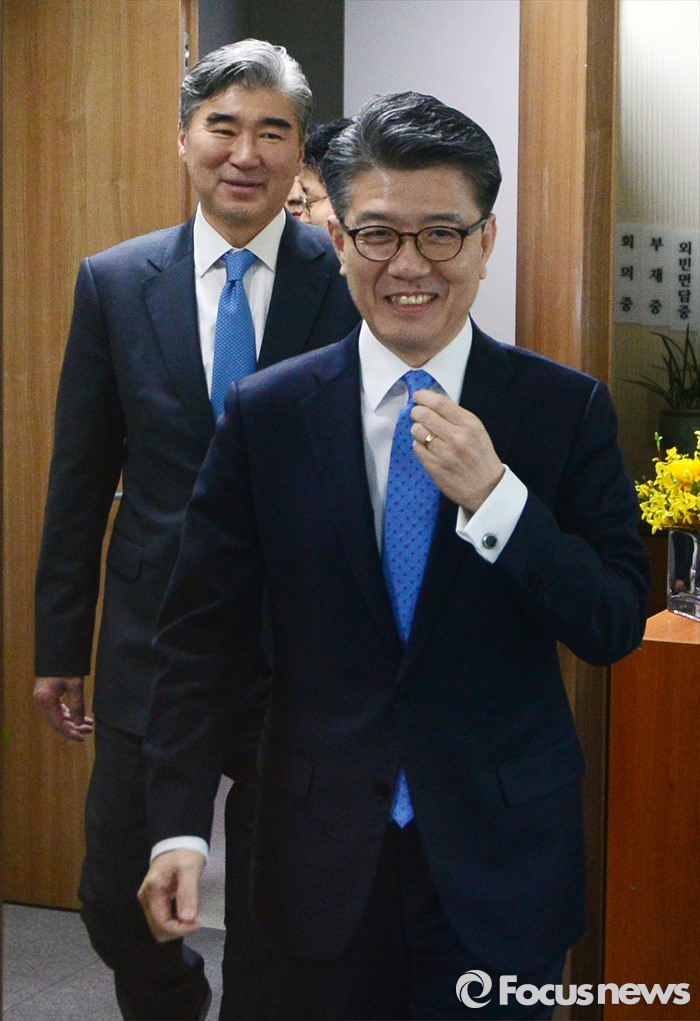 (서울=포커스뉴스) 성김 국무부 대북정책특별대표와 김홍균 한반도평화교섭본부장이 22일 서울 종로구 외교부에서 열린 '한·미 북핵 6자회담'에 참석해 자리로 향하고 있다.