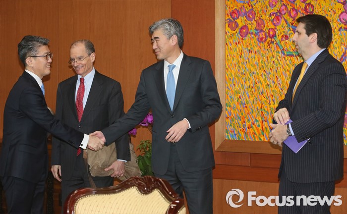 (서울=포커스뉴스) 김홍균 한반도평화교섭본부장이 22일 오후 서울 종로구 외교부에서 성김 미 국무부 대북정책특별대표와 인사를 나누고 있다.
