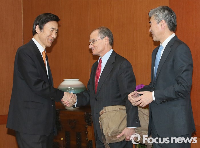 (서울=포커스뉴스) 윤병세 외교부 장관이 22일 오후 서울 종로구 외교부에서 대니얼 프리드 미 국무부 제재정책조정관, 성김 미 국무부 대북정책특별대표와 만나 인사를 나누고 있다.