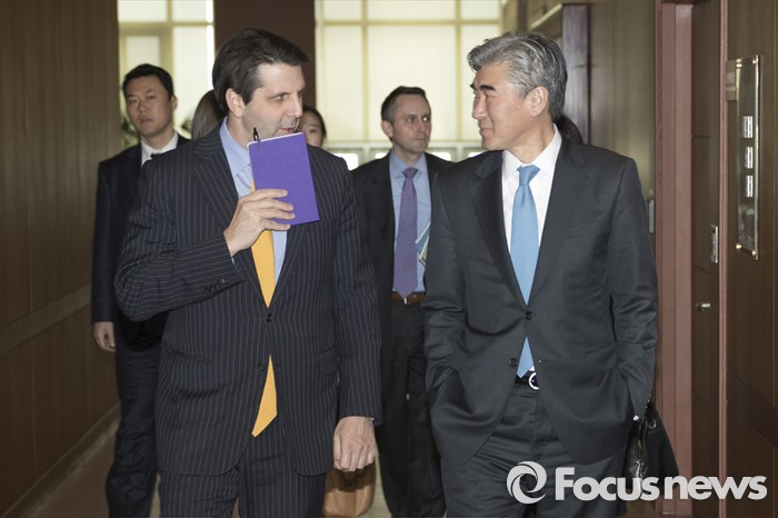 (서울=포커스뉴스) 성김(오른쪽) 미 국무부 대북정책특별대표와 마크 리퍼트 주한미국대사가 22일 오후 서울 종로구 외교부에서 대화를 나누며 장관대접견실로 향하고 있다.