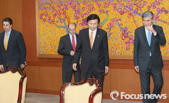(서울=포커스뉴스) 윤병세 외교부 장관이 22일 오후 서울 종로구 외교부에서 대니얼 프리드 미 국무부 제재정책조정관, 성김 미 국무부 대북정책특별대표, 마크 리퍼트 주한미국대사와 함께 자리로 향하고 있다.