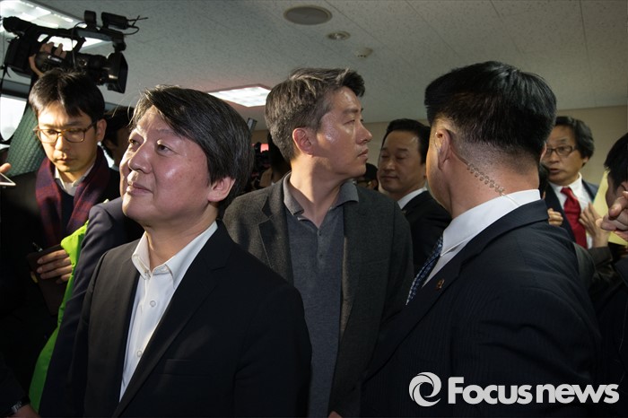 (서울=포커스뉴스) 22일 오후 서울 마포구 국민의당 당사에서 안철수 국민의당 상임공동대표가 PI론칭 발표를 마친 후 브리핑실을 나서다 공천에서 떨어진 전 농구선수 김해곤 씨의 강한 항의를 피해 당사를 떠나고 있다.