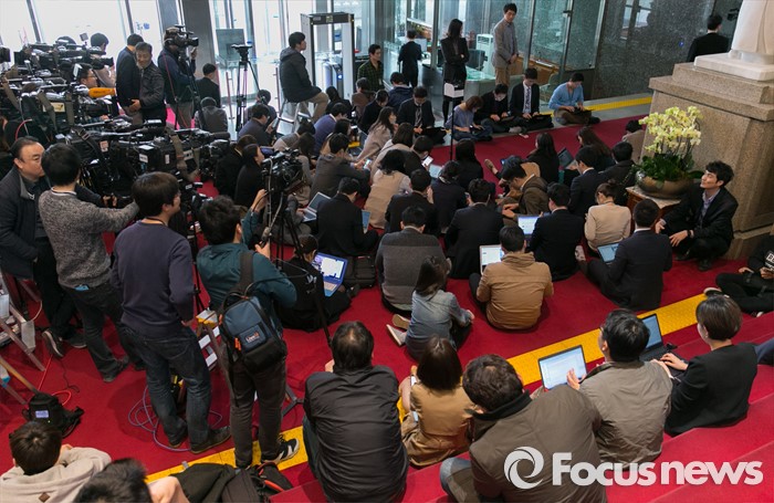 (서울=포커스뉴스) 22일 오후 서울 여의도 국회에서 취재진이 비공개 회의에 참석한 김종인 더불어민주당 비대위 대표를 기다리고 있다.