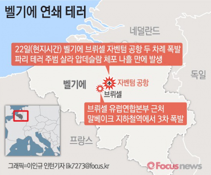 (서울=포커스뉴스) 22일(현지시간) 브뤼셀 자벤텀 국제공항에서 일어난 두 차례 폭발에 이어 말베이크역에서 세 번째 폭발이 일어났다.
