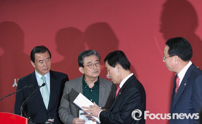 (서울=포커스뉴스) 이한구(왼쪽 두번째) 새누리당 공천관리위원장과 황진하(오른쪽 두번째) 공천관리위원이 22일 오후 서울 여의도 당사 기자실에서 4.13 총선 비례대표 후보자 발표 중, 논의하고 있다.