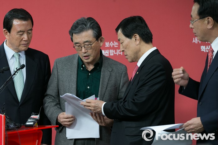 (서울=포커스뉴스) 이한구(왼쪽 두번째) 새누리당 공천관리위원장과 황진하(오른쪽 두번째) 공천관리위원이 22일 오후 서울 여의도 당사 기자실에서 4.13 총선 비례대표 후보자 발표 중, 논의하고 있다.
