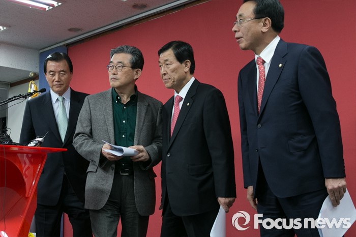 (서울=포커스뉴스) 홍문표(왼쪽부터) 새누리당 공천관리위원, 이한구 위원장, 황진하, 김회선 위원이 22일 오후 서울 여의도 당사 기자실에서 4.13 총선 비례대표 후보자 발표를 마친 뒤, 단상을 내려오고 있다.