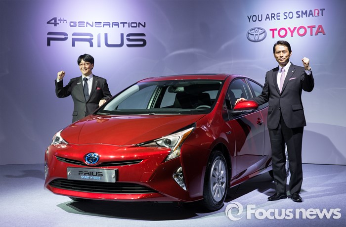 (서울=포커스뉴스) 22일 오전 서울 중구 웨스틴 조선호텔에서 요시다 아키히사(오른쪽) 한국토요타 사장과 토요시마 코지 프리우스 수석 엔지니어 신형 4세대 프리우스를 선보이고 있다.