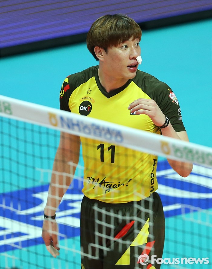 (안산=포커스뉴스) 22일 안산상록수체육관에서 열린 2015-2016 V-리그 남자부 챔피언결정전 3차전 OK저축은행-현대캐피탈 경기에서 OK저축은행 박원빈이 코피를 흘린뒤 코를 틀어막고 경기를 하고 있다.