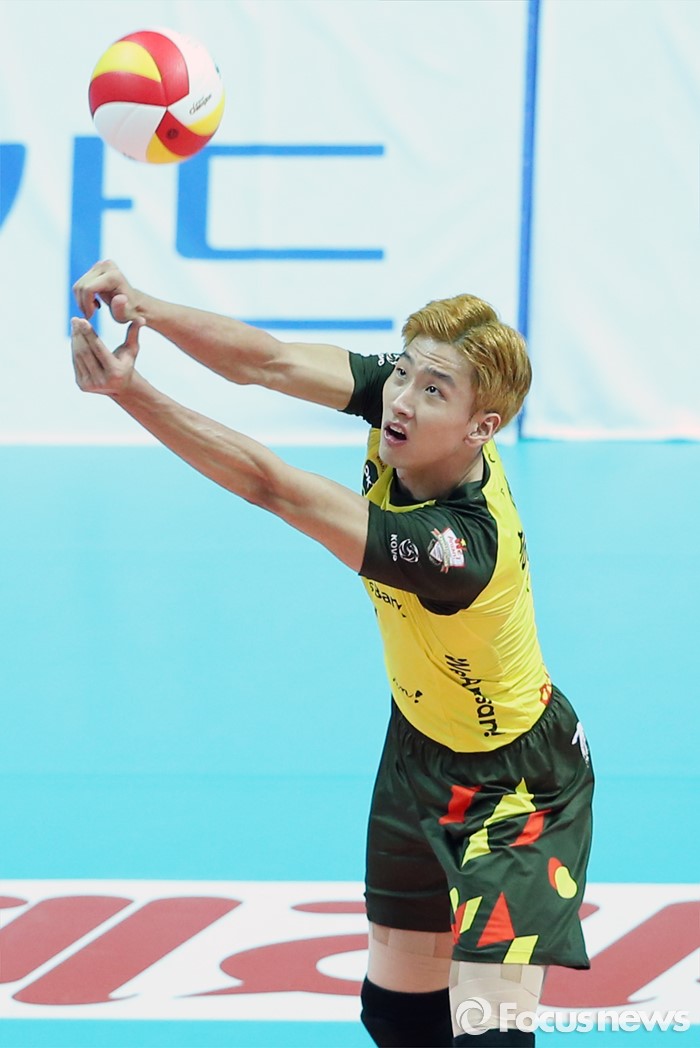 (안산=포커스뉴스) 22일 안산상록수체육관에서 열린 2015-2016 V-리그 남자부 챔피언결정전 3차전 OK저축은행-현대캐피탈 경기에서 OK저축은행 송명근이 후위에서 볼을 띄워주고 있다.