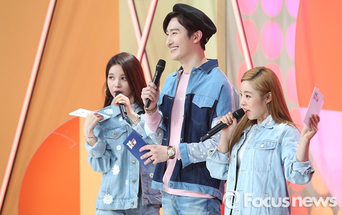 (서울=포커스뉴스) 22일 오후 서울 마포구 SBS프리즘 타워에서 열린 2016 '더쇼' 생방송 현장에 진행자 솔라(왼쪽부터), 조미, 휘인이 오프닝을 하고 있다.