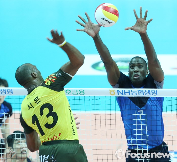 (안산=포커스뉴스) 22일 안산상록수체육관에서 열린 2015-2016 V-리그 남자부 챔피언결정전 3차전 OK저축은행-현대캐피탈 경기에서 현대캐피탈 오레올이 OK저축은행 시몬의 공격을 블로킹으로 막고 있다.