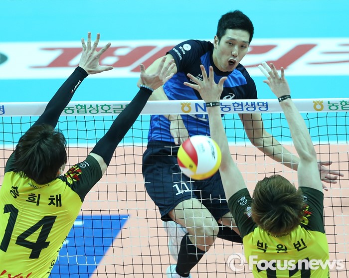(안산=포커스뉴스) 22일 안산상록수체육관에서 열린 2015-2016 V-리그 남자부 챔피언결정전 3차전 OK저축은행-현대캐피탈 경기에서 현대캐피탈 최민호가 속공으로 OK저축은행 송희채, 박원빈의 블로킹을 뚫고 있다.