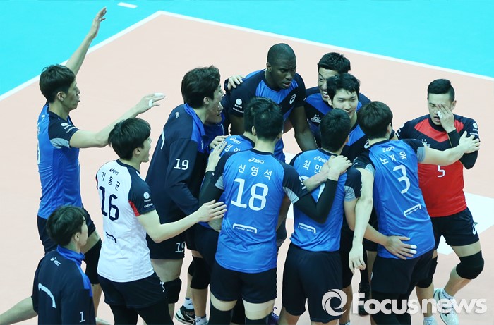 (안산=포커스뉴스) 22일 안산상록수체육관에서 열린 2015-2016 V-리그 남자부 챔피언결정전 3차전에서 OK저축은행에 승리해 2패 후 1승을 올린 현대캐피탈 선수들이 환호하며 기뻐하고 있다.