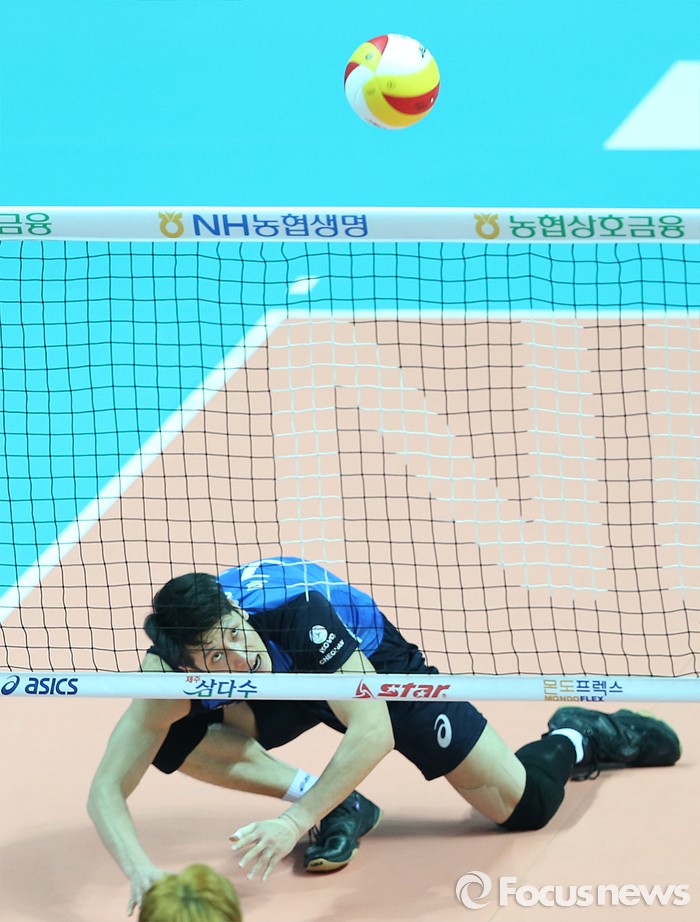 (안산=포커스뉴스) 22일 안산상록수체육관에서 열린 2015-2016 V-리그 남자부 챔피언결정전 3차전 OK저축은행-현대캐피탈 경기에서 현대캐피탈 문성민이 리시브한 볼을 쳐다보고 있다.
