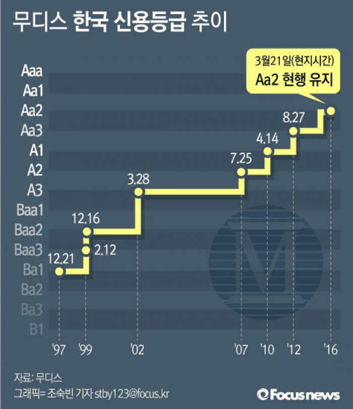 (서울=포커스뉴스) 21일(현지시간) 국제신용평가사인 무디스(Moody's)가 한국의 국가신용등급을 현행 'Aa2'로 유지한다고 밝혔다.