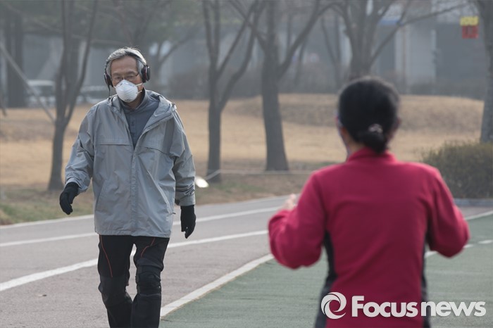 (고양=포커스뉴스) 꽃샘추위가 다시 시작된 23일 오전 경기도 고양시 일산 호수공원에서 시민들이 운동을 하고 있다. 미세먼지는 수도권에서 아침 한때 '나쁨'이 되겠지만 곧 '보통' 수준으로 회복될 것을 예상한다.