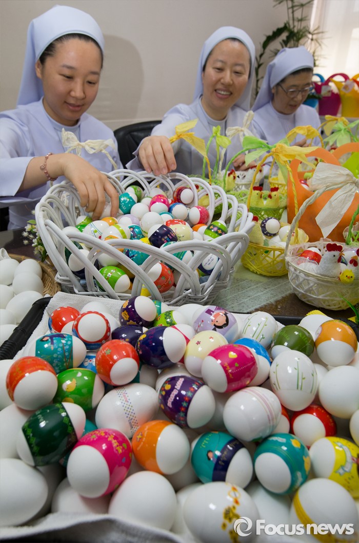 (대전=포커스뉴스) 부활절을 앞두고 23일 오전 대전 중구 가톨릭대학교 대전성모병원 원목팀 수녀들이 정성스럽게 꾸민 달걀을 바구니에 담고 있다. 이날 가톨릭대학교 대전성모병원 직원들은 생명의 탄생을 의미하는 부활 달걀 총 3000여개를 병동의 환자 및 보호자, 지역주민들에게 전달했다.
