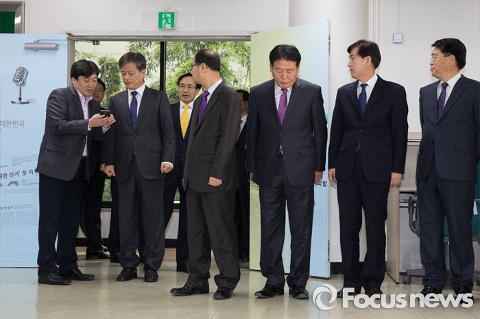 (과천=포커스뉴스) 20대 총선 후보자 등록을 앞둔 23일 오전 경기도 정부 과천 청사에서 이인복(왼쪽 두 번째) 중앙선거관리위원장이 공명선거 관련 대국민 담화문 발표에 앞서 관게자들과 이야기 하고 있다.