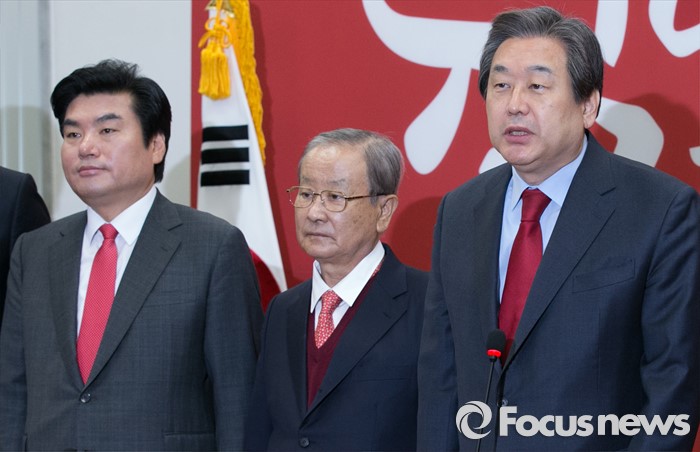 (서울=포커스뉴스) 김무성(오른쪽) 새누리당 대표가 23일 오전 서울 여의도 국회에서 열린 최고위원회의에 참석해, 강봉균(가운데) 공동선대위원장을 소개하고 있다.