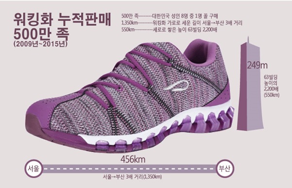 우리나라 성인 인구가 4100만여명인 점을 감안할 때 8명 중 1명이 프로스펙스 워킹화를 구입한 셈이다. 지금까지 판매된 워킹화를 일렬로 세우면 서울에서 부산까지 거리의 3배인 1350km에 달한다. 높이(270mm 사이즈, 높이 11cm 기준)로 치면 여의도 63빌딩의 2200배에 달하는 550km에 해당한다.