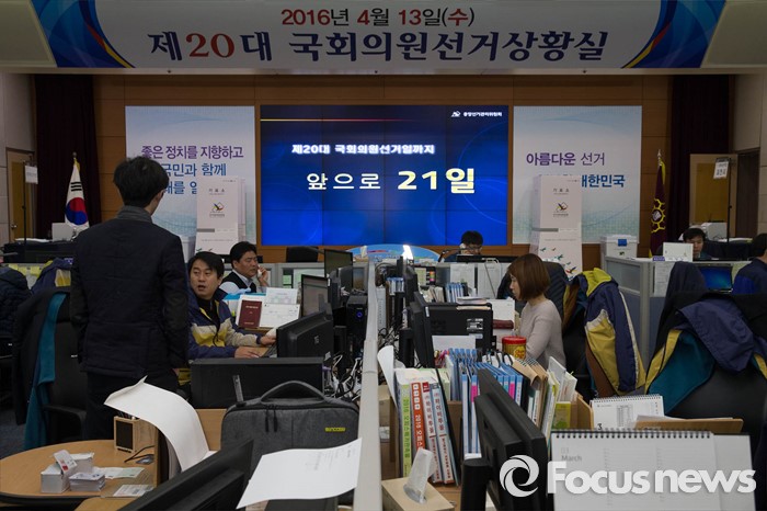 (과천=포커스뉴스) 20대 총선 후보자 등록을 하루 앞둔 23일 오전 경기도 정부 과천 청사 선거 상황실에서 근무자들이 업무에 열중하고 있다.