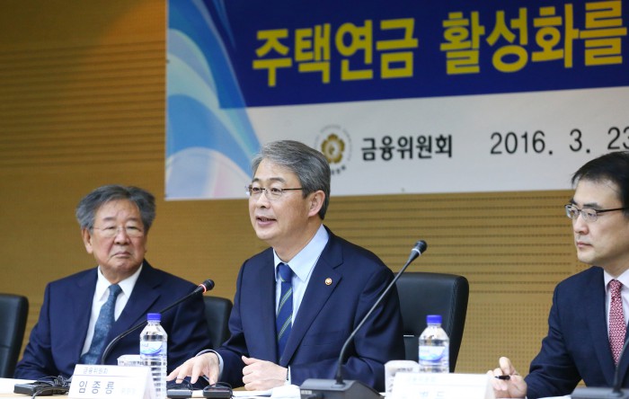 또 임종룡 위원장은 "주거용 오피스텔로도 주택연금에 가입할 수 있도록 하기 위해 금년 하반기 중 주택금융공사법 개정도 추진할 것"이라고 했다.23일 서울 중구 주택금융공사 서울중부지사에서 열린 '주택연금 활성화를 위한 현장간담회'에서 임종룡 금융위원장(사진 가운데)이 모두 발언을 하고 있다. 사진 오른쪽부터 손병두 금융위 금융정책국장, 임종룡 위원장, 주택연금 홍보대사인 배우 최불암.<사진제공=금융위원회>