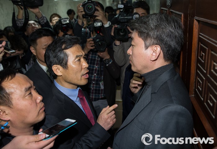 (서울=포커스뉴스) 23일 오전 서울 여의도 국회에서 열린 국민의당 비공개 최고위원회의 도중 공천탈락 후 결선투표를 주장하고 있는 김승남 의원과 지지자들이 회의장 진입을 시도하며 당직자들에게 항의하고 있다.