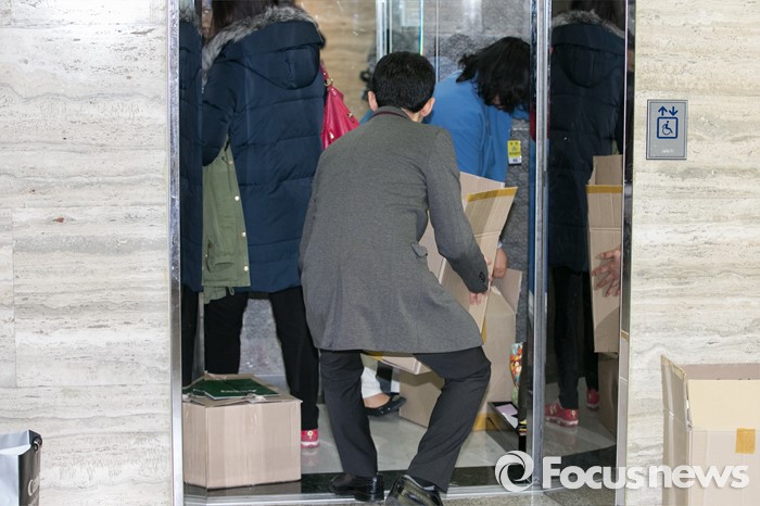 (서울=포커스뉴스) 국민의당 당직자들이 23일 오전 서울 여의도 국회에서 공천장 수여식 비품을 당사로 급히 옮기고 있다. 이날 국회에서 열릴 예정이었던 공천장 수여식은 공천 탈락 후보들의 반발로 당사에서 진행됐다.