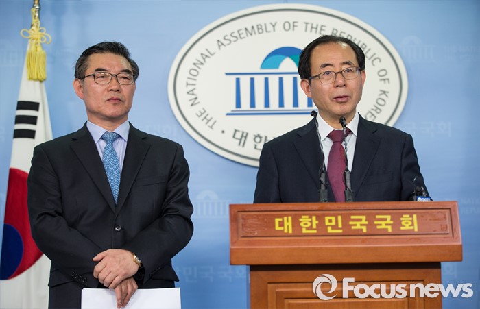 (서울=포커스뉴스) 20대 총선 서울 강남갑 험지로 전략 공천된 김성곤(오른쪽) 더불어민주당 의원이 23일 오후 서울 여의도 국회 정론관에서 김성욱 전 지역위원장과 함께 기자회견을 하고 있다.