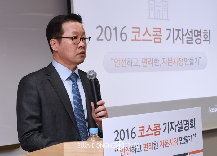 | △ 코스콤 신평호 전무가 23일 '안전하고 편리한 자본시장 만들기'를 주제로 개최된 기자설명회에서 인사말을 하고 있다 |