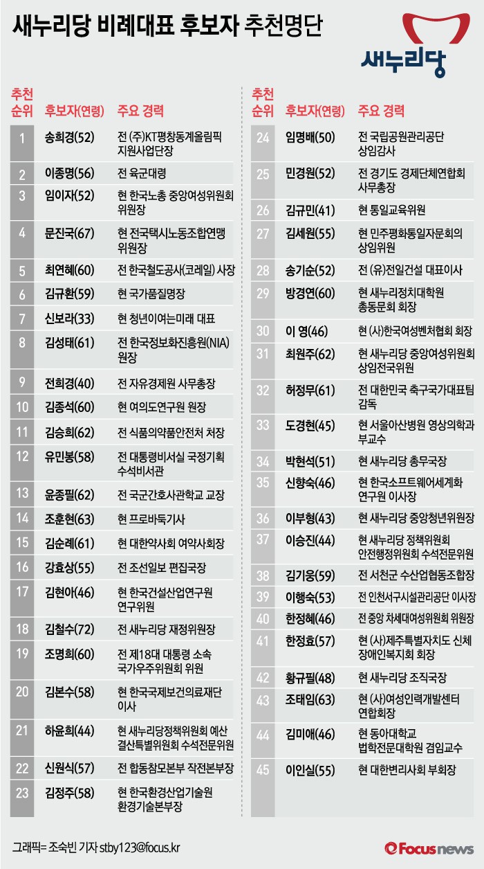 (서울=포커스뉴스) 새누리당이 23일 오는 20대 총선에 나설 비례대표 후보자 45명의 명단을 발표했다.