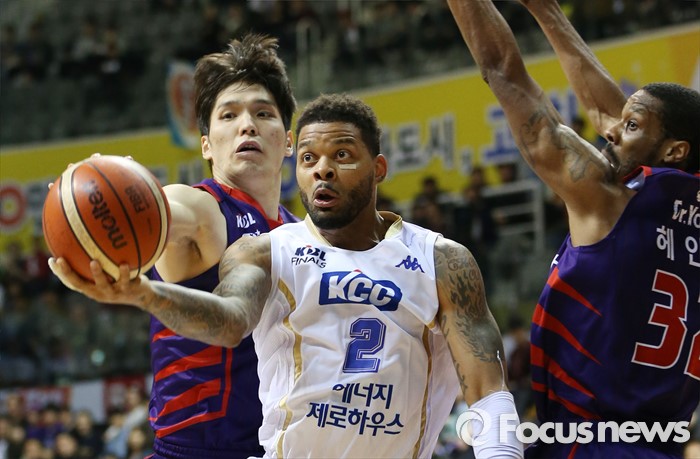 (고양=포커스뉴스) 23일 고양체육관에서 열린 2015-2016 프로농구 챔피언결정전 3차전 오리온-KCC경기에서 KCC 에밋이 오리온 장재석과 헤인즈의 수비 사이를 뚫으며 레이업슛을 시도하고 있다.