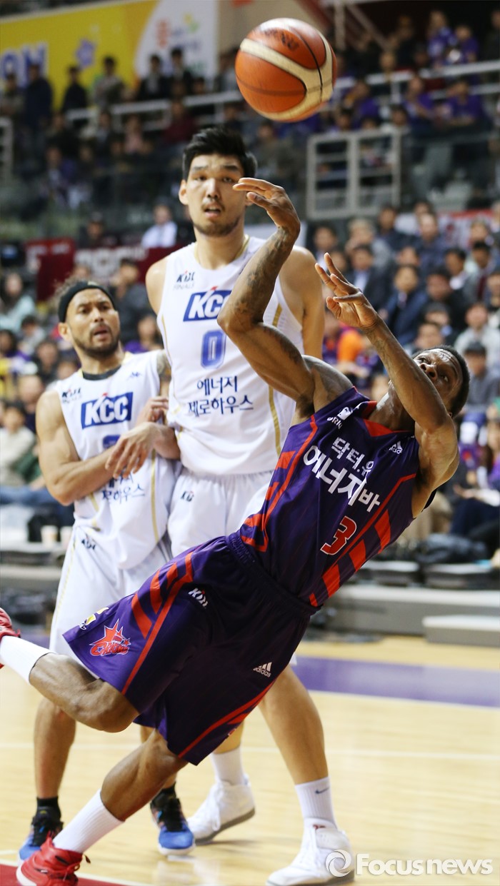 (고양=포커스뉴스) 23일 고양체육관에서 열린 2015-2016 프로농구 챔피언결정전 3차전 오리온-KCC경기에서 오리온 조 잭슨이 KCC 하승진의 파울에 걸려 넘어지며 슈팅을 하고 있다.