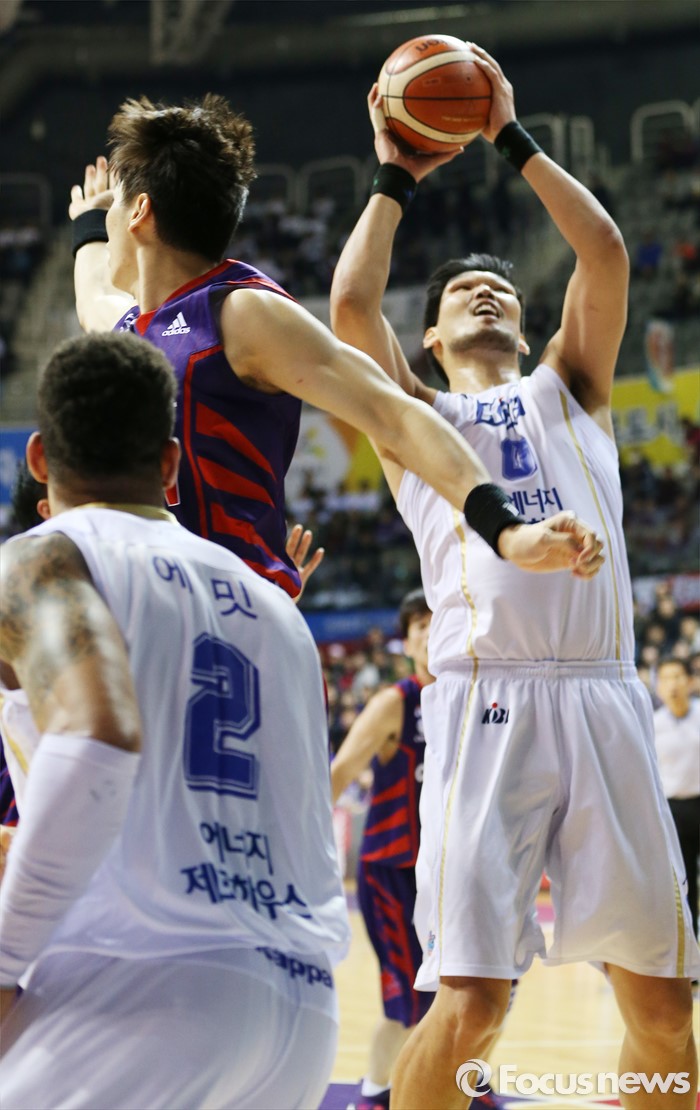 (고양=포커스뉴스) 23일 고양체육관에서 열린 2015-2016 프로농구 챔피언결정전 3차전 오리온-KCC경기에서 KCC 하승진이 오리온 장재석을 제치고 리바운드볼을 잡아 슈팅하고 있다.