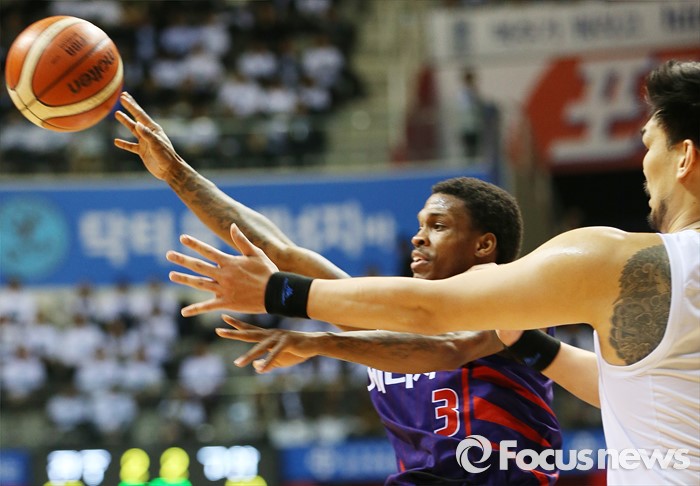 (고양=포커스뉴스) 23일 고양체육관에서 열린 2015-2016 프로농구 챔피언결정전 3차전 오리온-KCC경기에서 오리온 조 잭슨이 KCC 하승진의 마크를 피해 패스하고 있다.