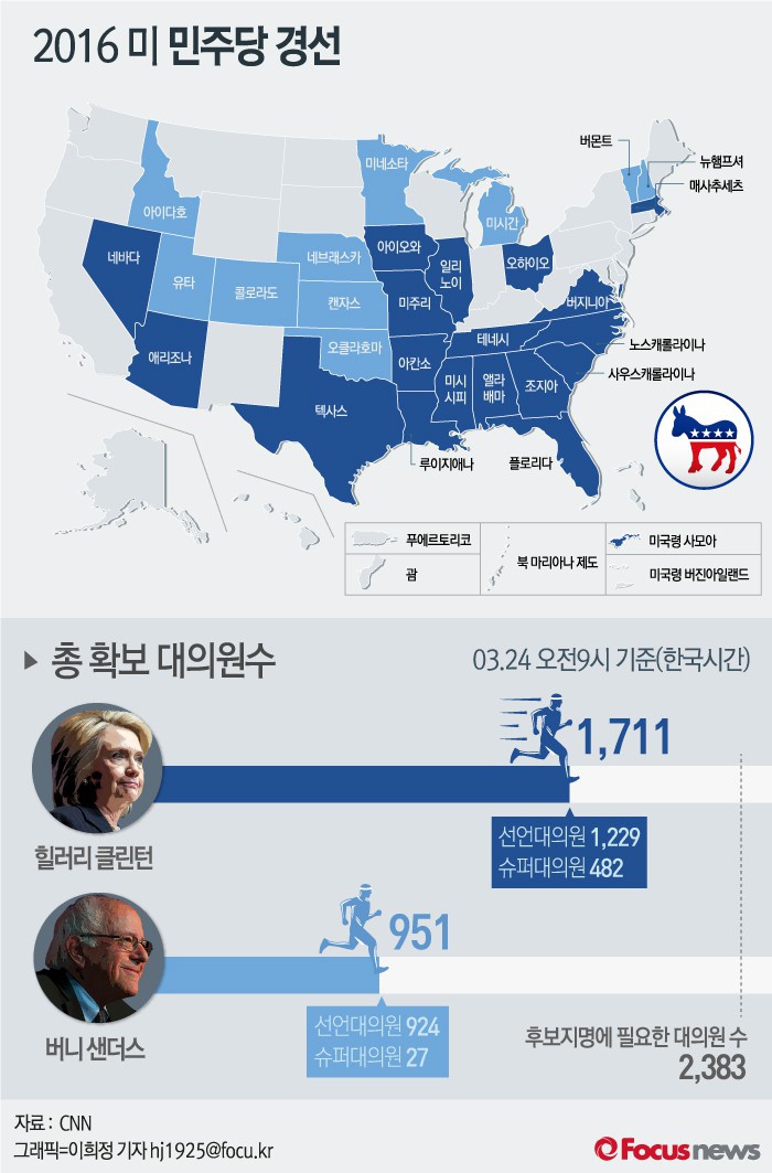 (서울=포커스뉴스) 22일(현지시간) 미국 대선 후보를 가리는 '웨스턴 화요일' 경선에서 민주당 힐러리 클린턴 전 국무장관 가장 큰 경선 지역인 애리조나에서 승리했다. 유타주와 아이다호 경선에서는 샌더스 의원이 승리했다.