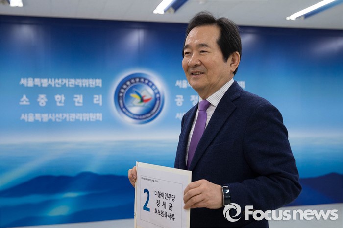 (서울=포커스뉴스) 20대 총선 후보자 등록이 시작된 24일 오전 서울 종로구 선관위에서 더불어민주당 정세균 후보가 등록 서류를 보이고 있다.